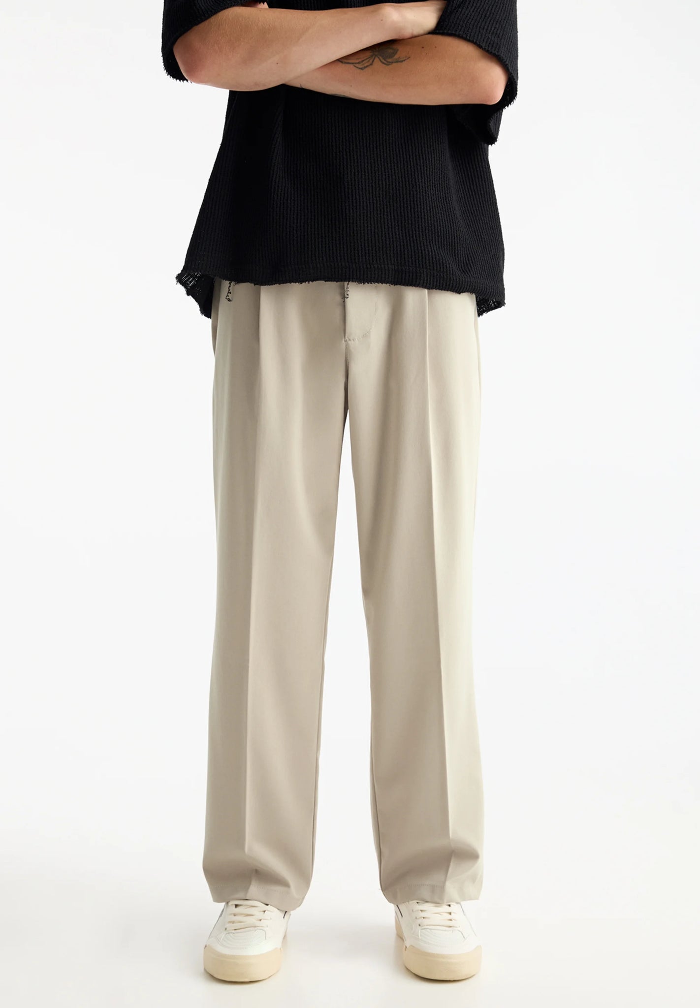 Com corte reto e ajuste solto, a calça apresenta comprimento até o tornozelo, sendo uma escolha versátil para composições modernas e sofisticadas.