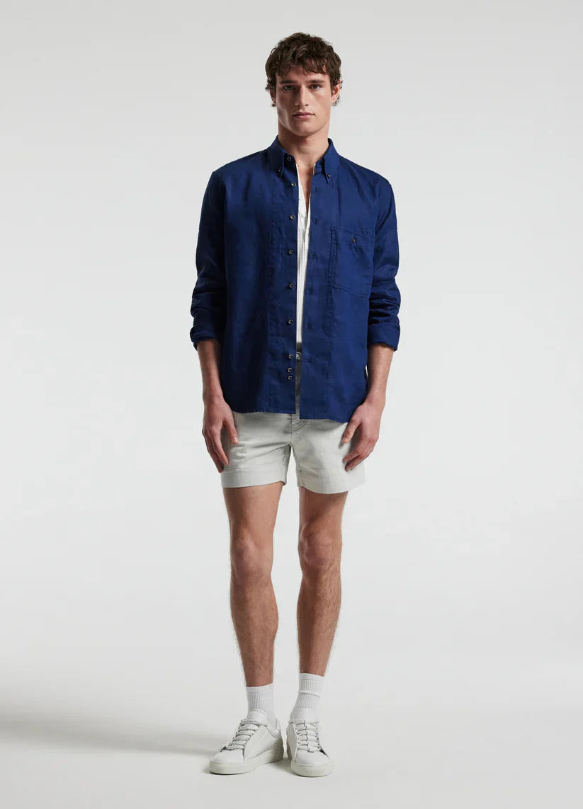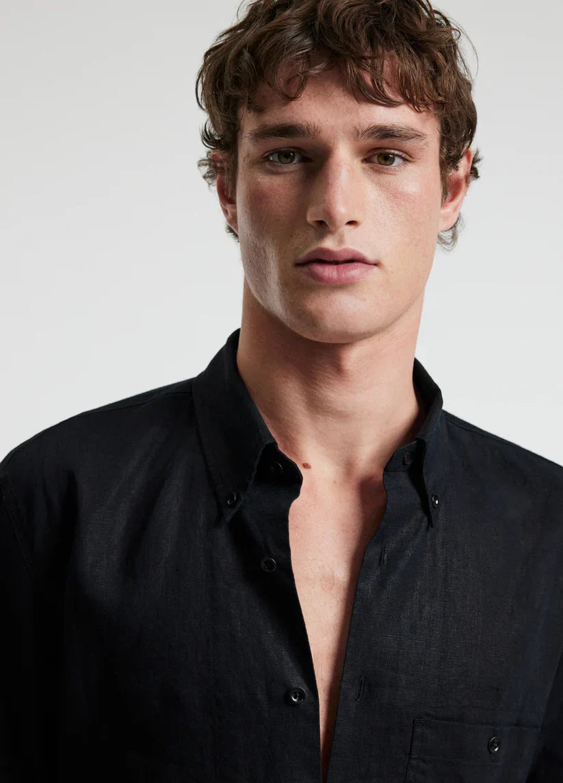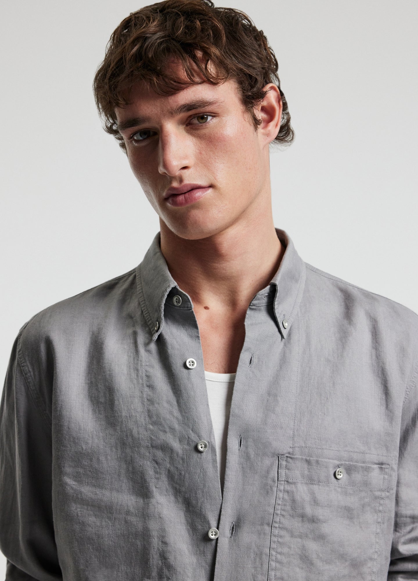 Camisa masculina modelo clássico confeccionada em linho puro, com bolso frontal e gola tradicional. Possui fechamento por botões e mangas longas, ideal para um visual sofisticado e versátil.